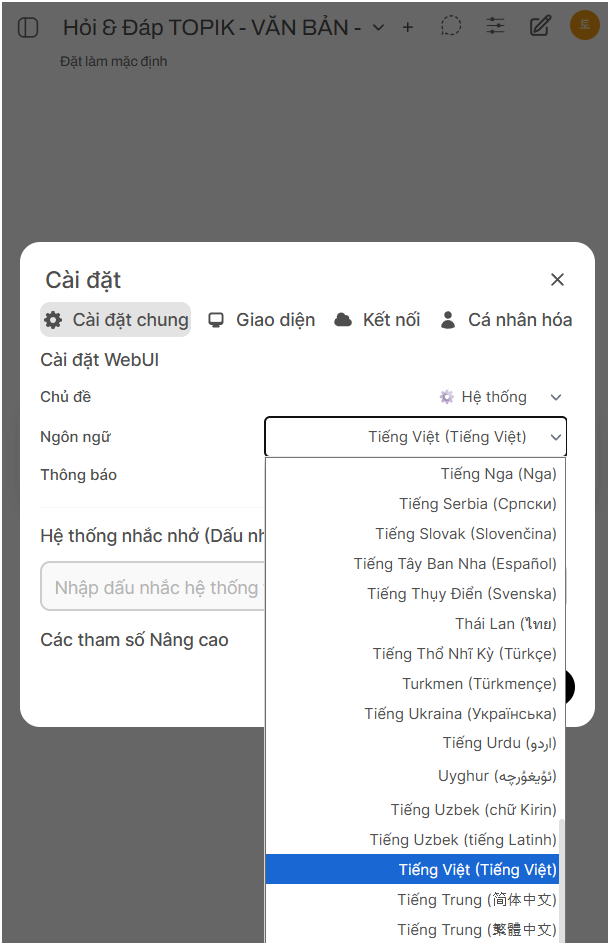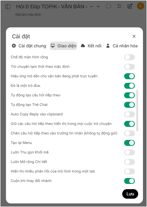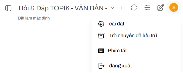 Để tùy chỉnh trải nghiệm sử dụng TOPIKBOT theo ý muốn của bạn, bạn có thể truy cập vào menu Cài đặt. Dưới đây là giải thích chi tiết cho từng mục.