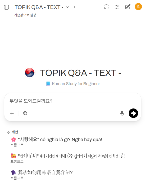 - TOPIK Q&A – TEXT – và ▾: Hiển thị chế độ trò chuyện hiện tại. Bạn có thể nhấn vào mũi tên (▾) để xem hoặc chuyển đổi sang các chế độ học tập khác. Dòng chữ